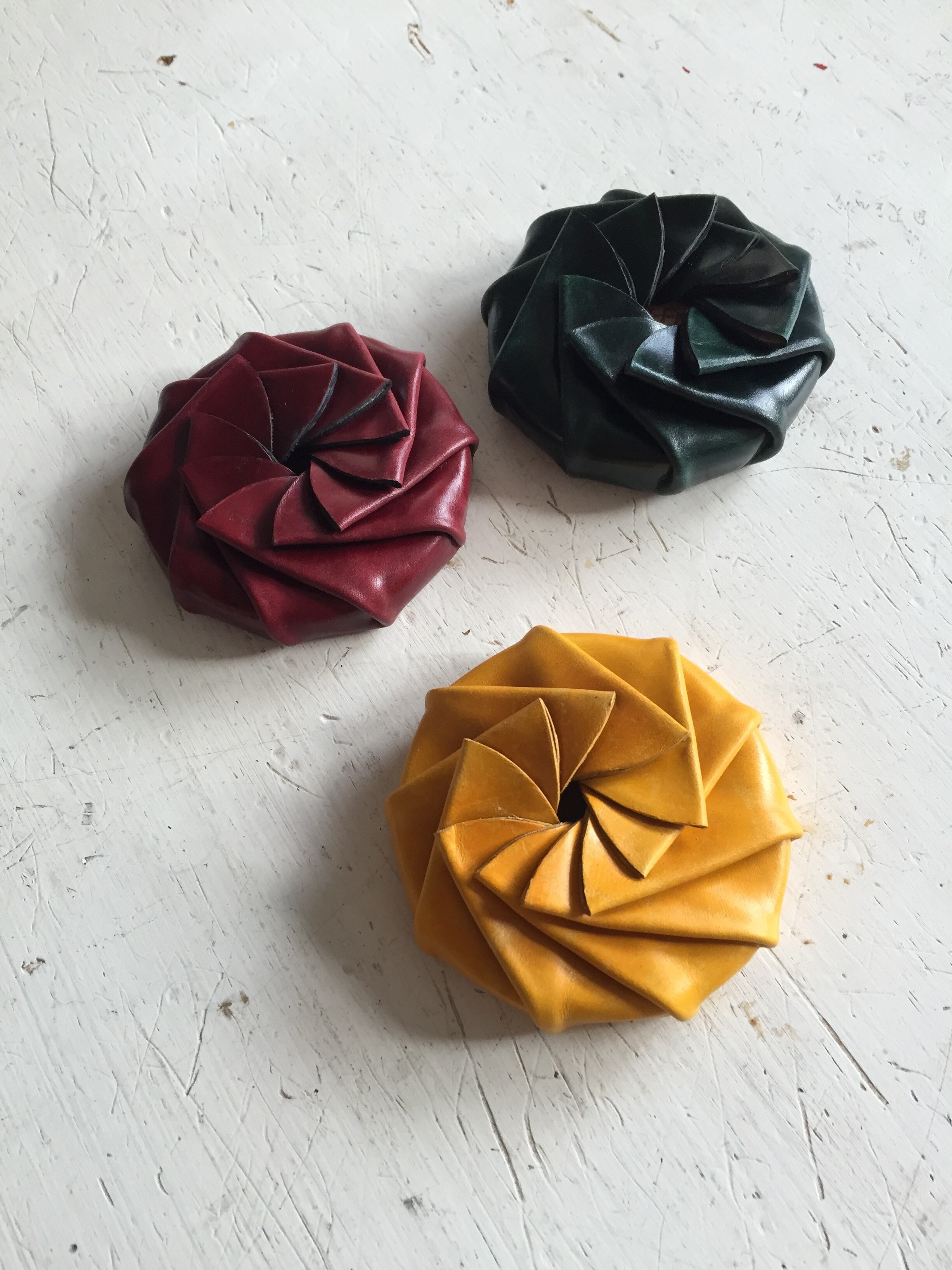 留め具を一切使わず、一枚革を折り紙のようにクセ付けしてコインケースを作りました。