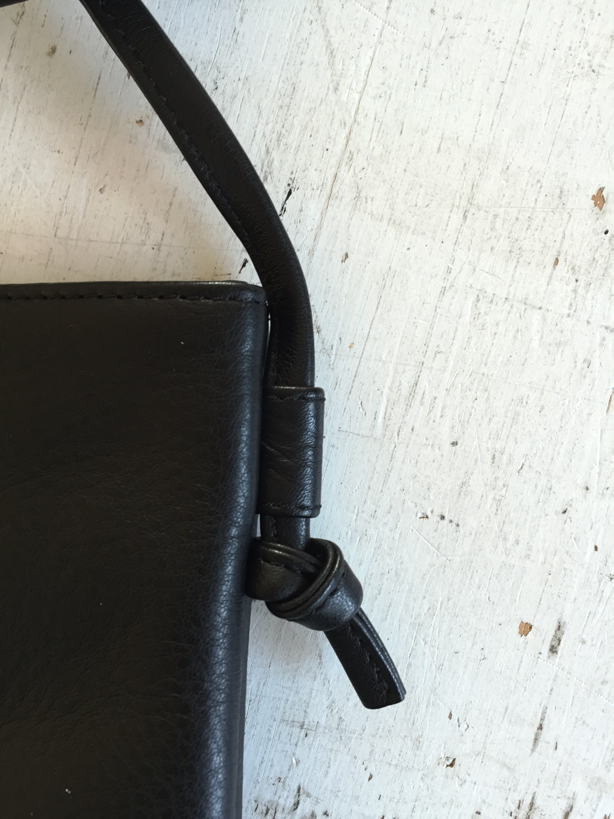 ショルダーベルトは4つ折りの上質な仕上げにし、ベルトに長さは結び目を変える事で長くも短くも調節できます。