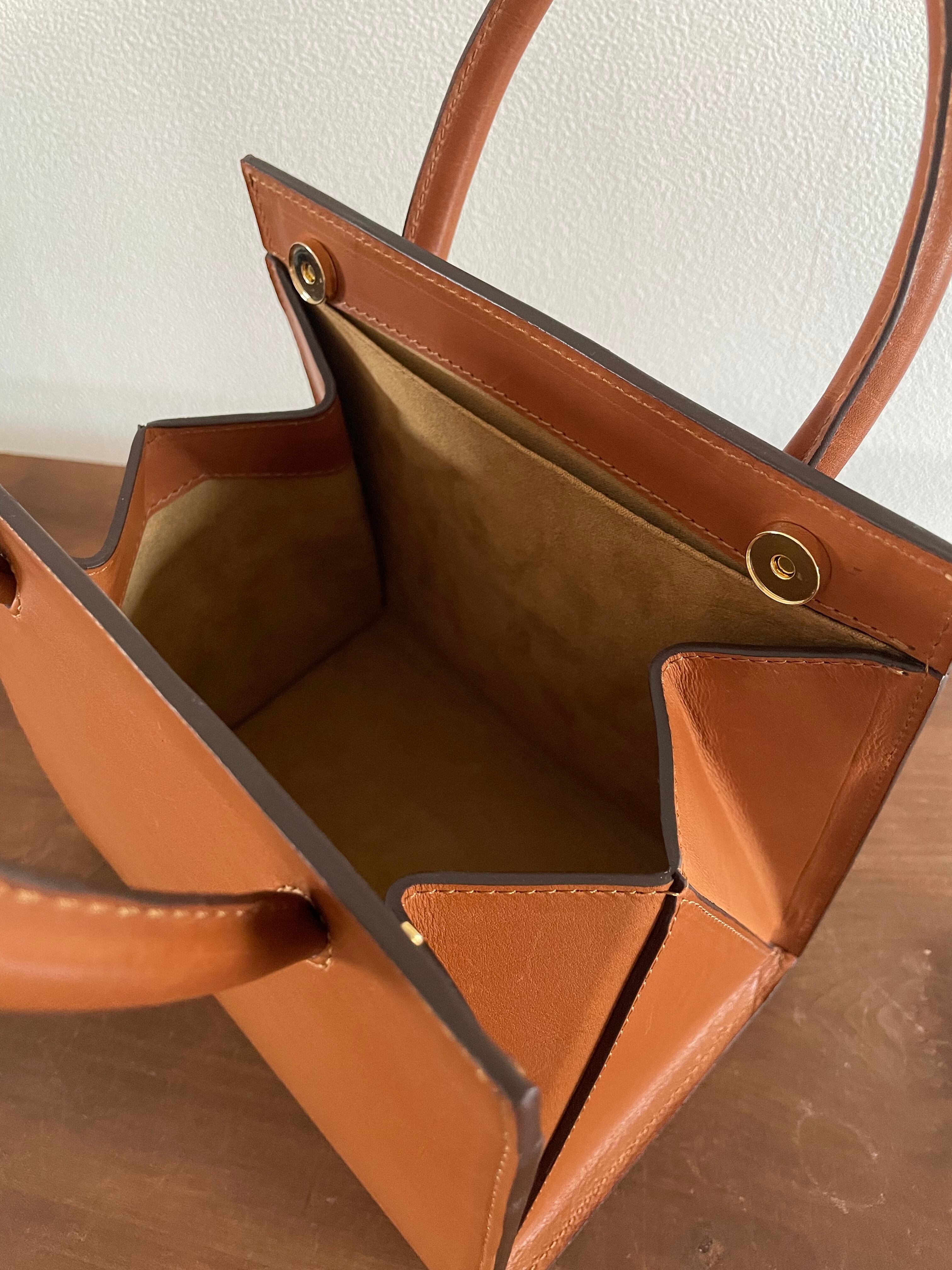 モノを入れられるように底マチの巾が13センチと広くなっていても、スッキリとした印象になるよう三角マチにしました。