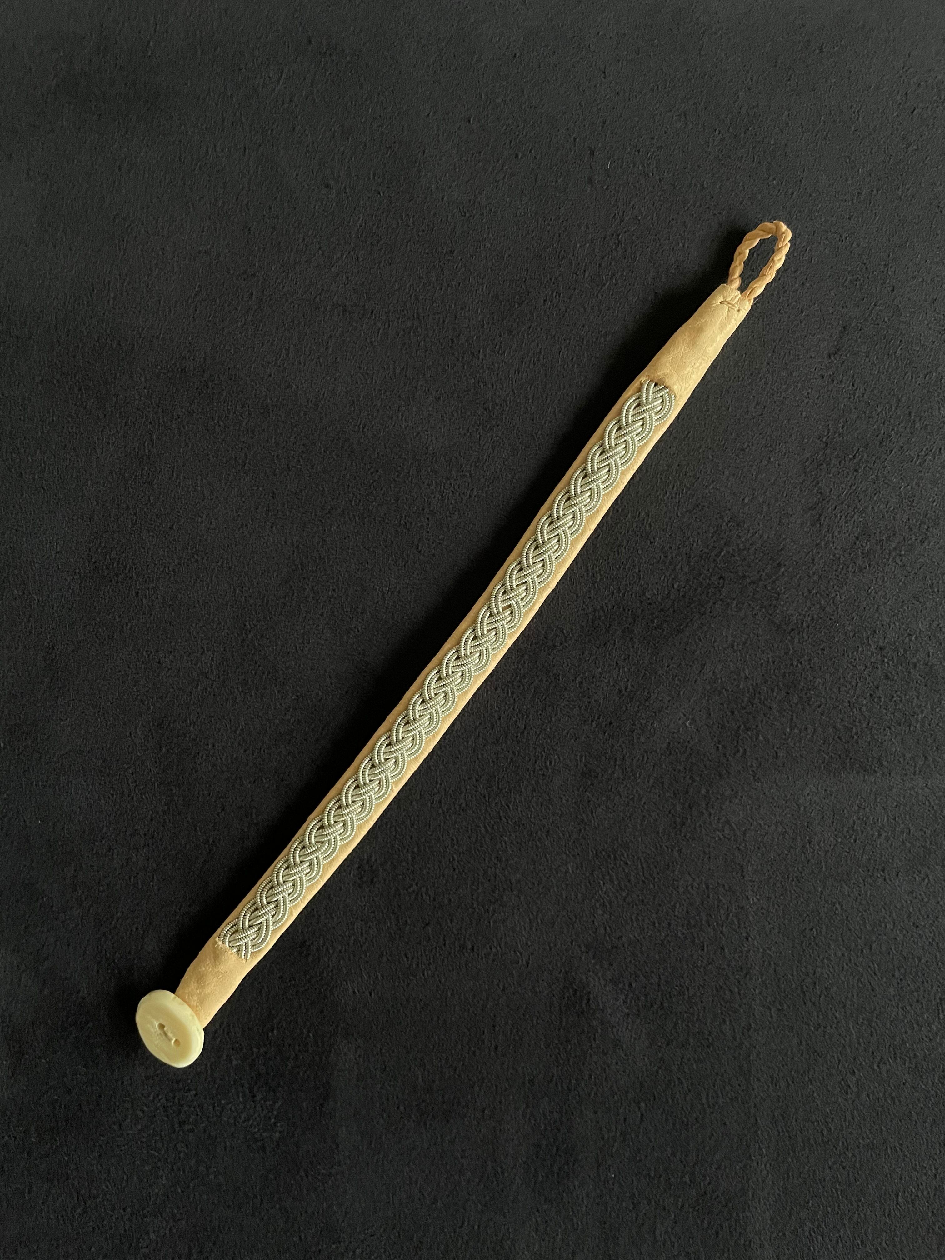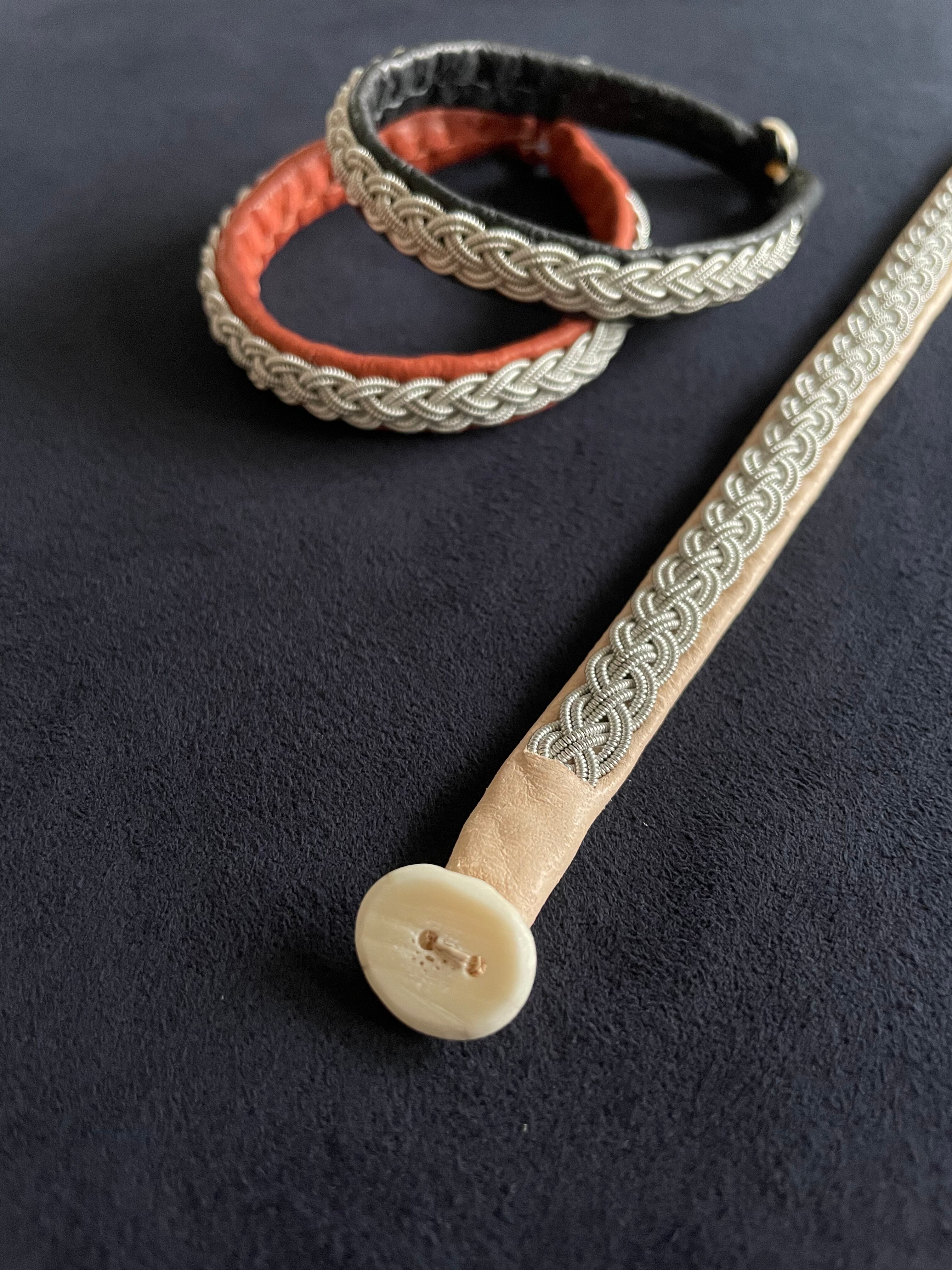 サーミの人々と同じ材料で作るよりも、サーミの人々の精神と同じような価値観で、命を奪ってしまったのならちゃんと利用したいとの思いから、今回エゾシカの革と角を利用してブレスレットを制作しました。
